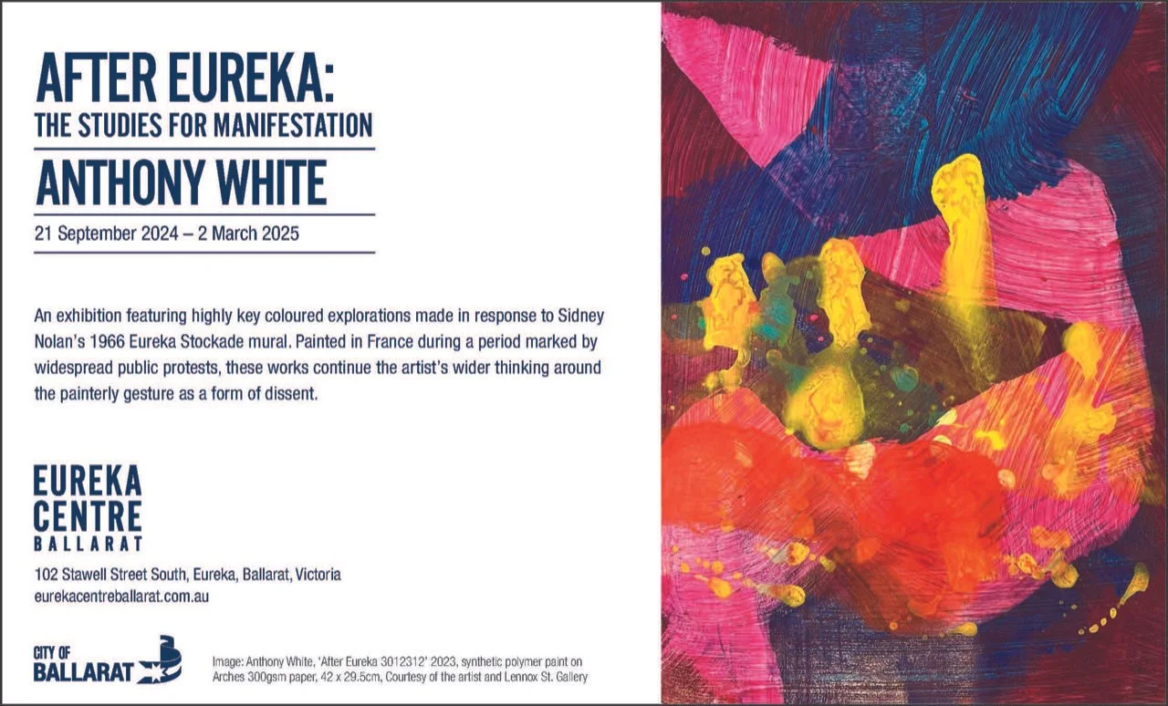 From Saturday, 21 September 2024, to Sunday, 2 March 2025, the Eureka Centre Ballarat will host "After Eureka: The Studies for Manifestation," an exhibition by Paris-based artist Anthony White. The show coincides with the 170th anniversary of the Eureka Stockade, Australia’s only armed civil uprising, and features White's preliminary studies created in response to Sidney Nolan’s 1966 Eureka Stockade mural.